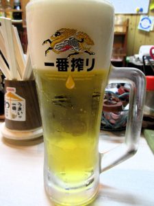 店内はカウンターが6席ほどとテーブルが2席。常連さんだろう人がお一人で、やってます。僕もカウウンターに腰かけてから「生ビール」をお願いしました。