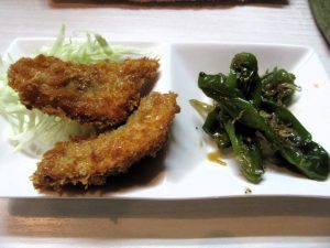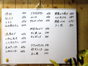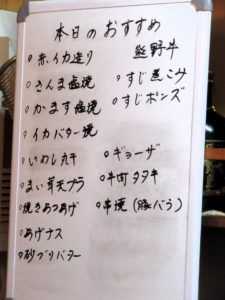 まずはお通しです。「イワシのフライ」と「唐辛子の素揚げ」。どこでも見る品ですが、これ最高でした。揚げ方、味付け、食材どれをとっても、この店の(女将さんの)実力が分かります。そこで品書きを見てみると‥