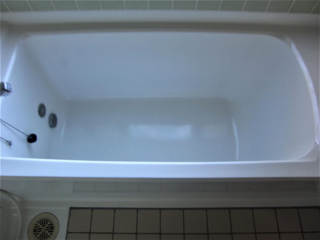 浴槽とシャワー栓付カウンターのリフィニッシュをご希望です。特に浴槽内には無数のヘアークラック(髪の毛状のヒビ)が入っています。補修後にカラーコーティングで再生しました。