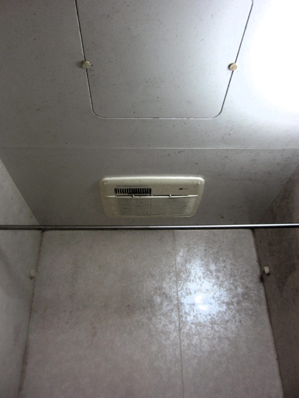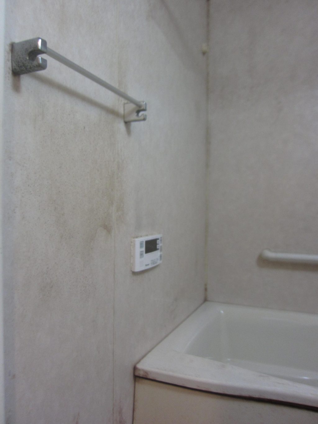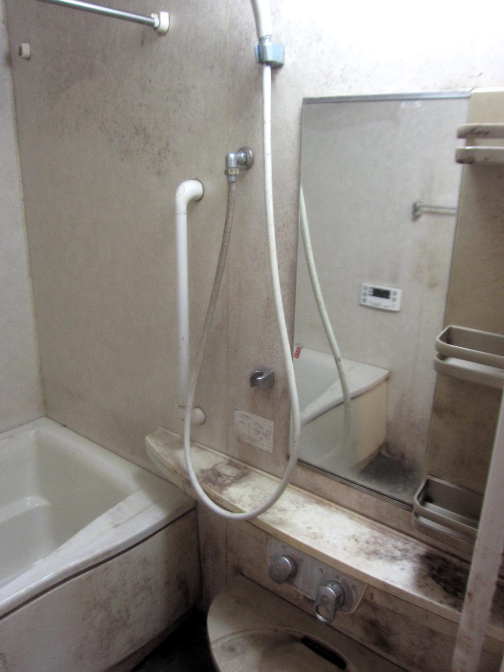 かなり汚れたユニットバスのリフィニッシュです。浴槽とミラーキャビネットはカラーコーティング。天井・壁面はフィルム貼り。洗い場床はシート貼り。以上で仕上げました。