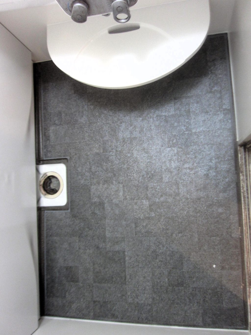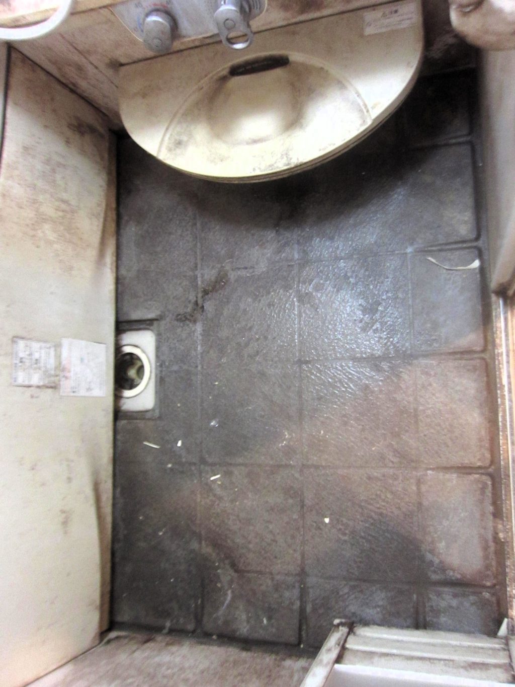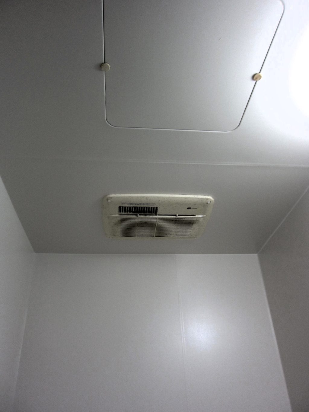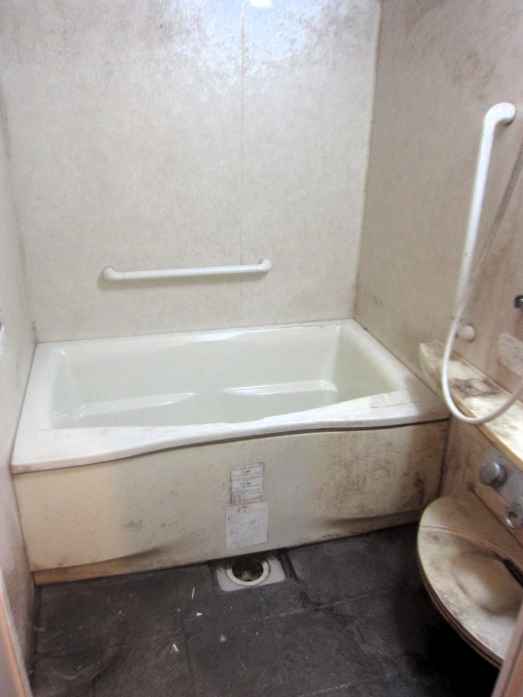 かなり汚れたユニットバスのリフィニッシュです。浴槽とミラーキャビネットはカラーコーティング。天井・壁面はフィルム貼り。洗い場床はシート貼り。以上で仕上げました。