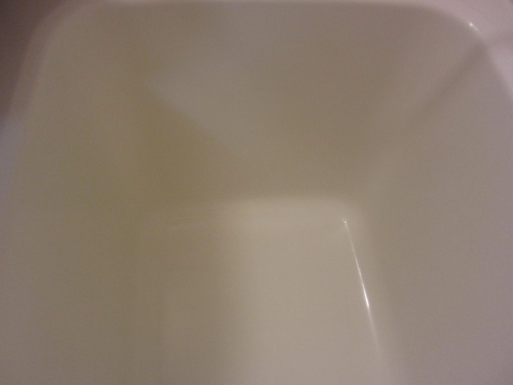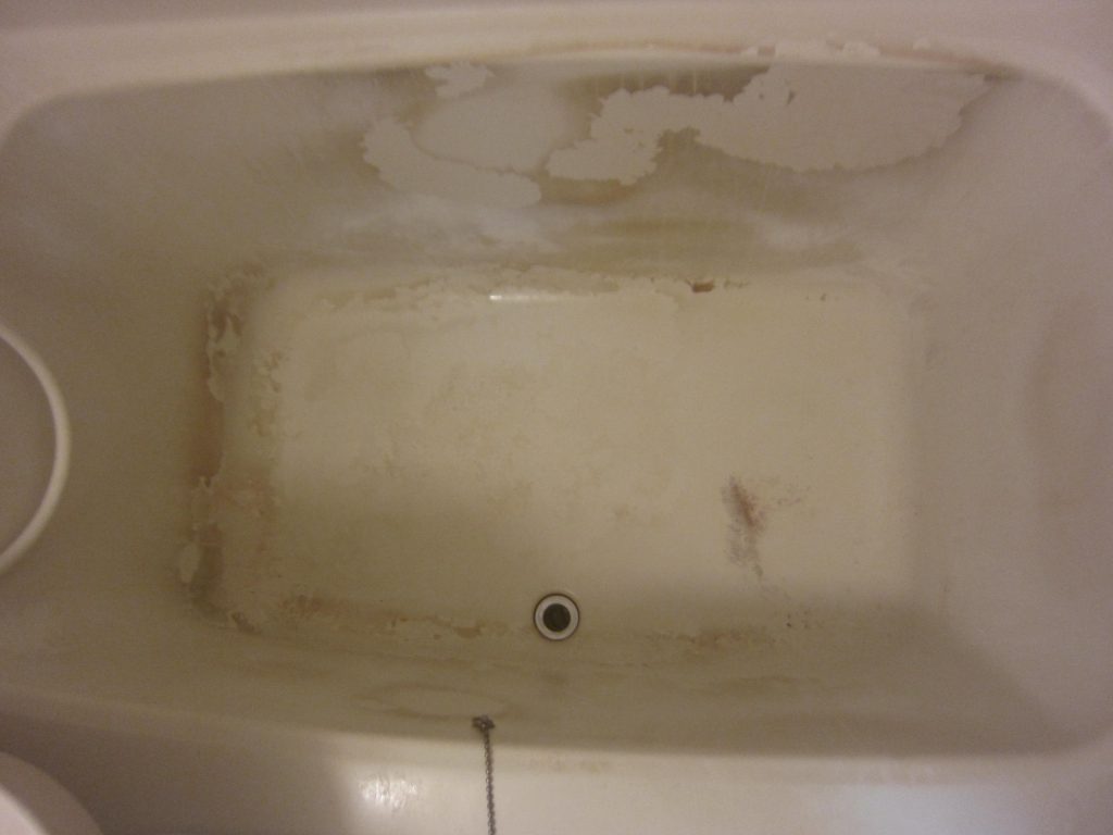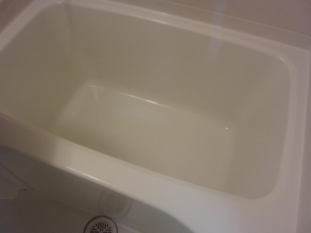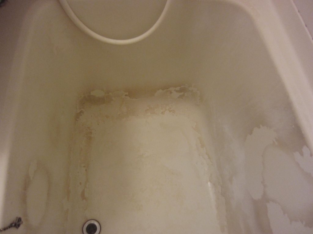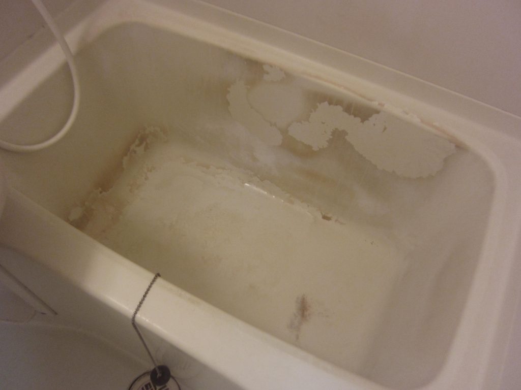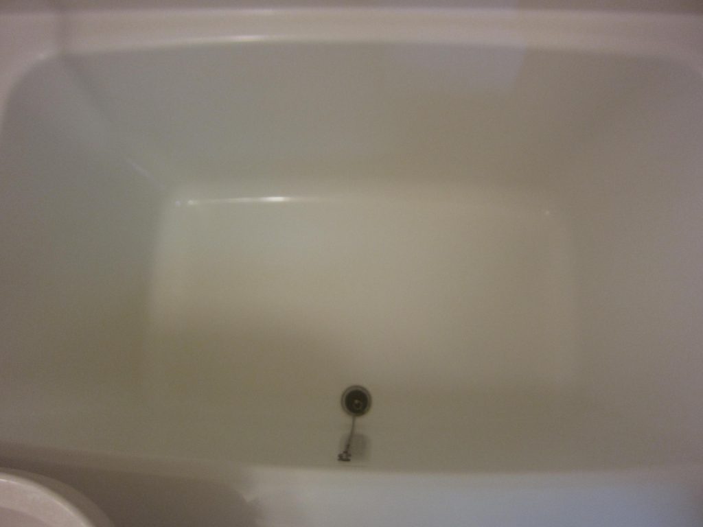 FRP浴槽に水垢汚れが、かなり付着しています。カラーコーティングで原状回復させました。